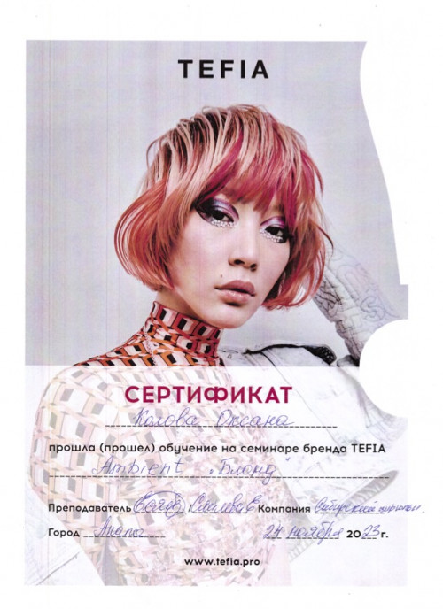 - TEFIA "Сибирский цирюльник".(Окрашивание, блонд,работа с сединой, реконструкция волос и уход и др.). г.Новороссийск